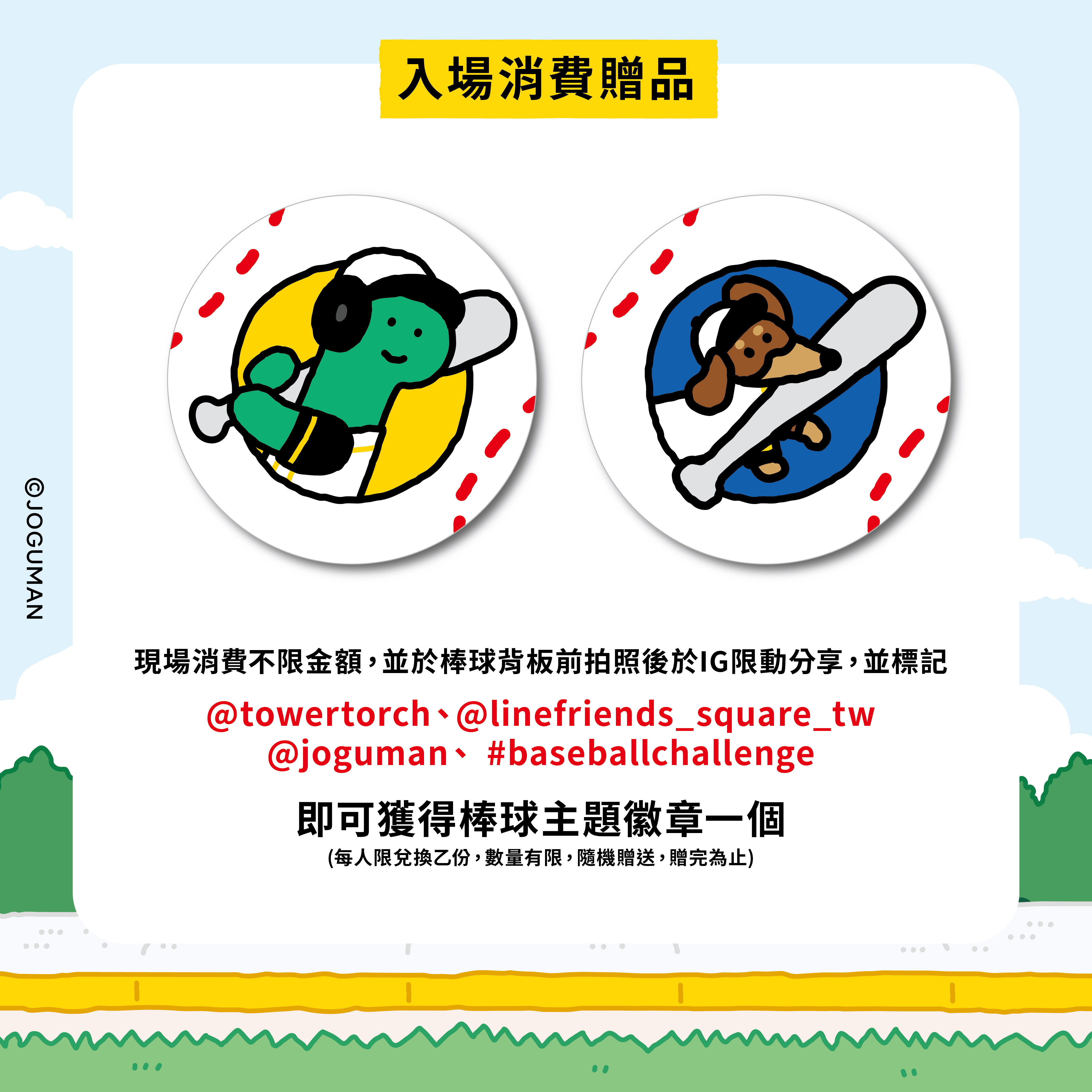 即可獲得 JOGUMAN 棒球徽章1個 (2款隨機贈送)。
