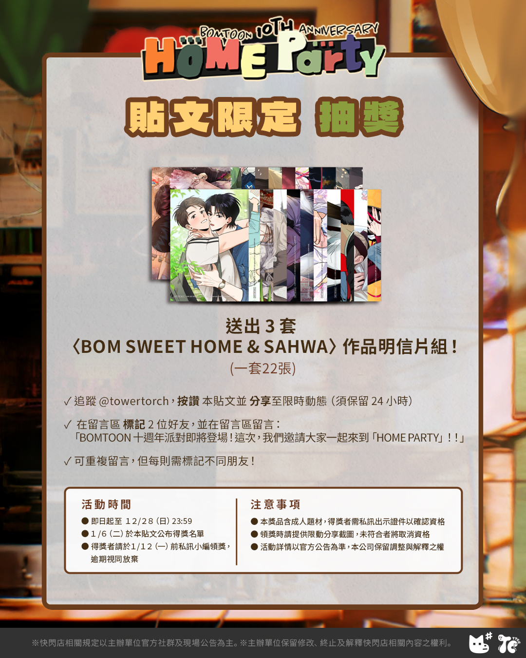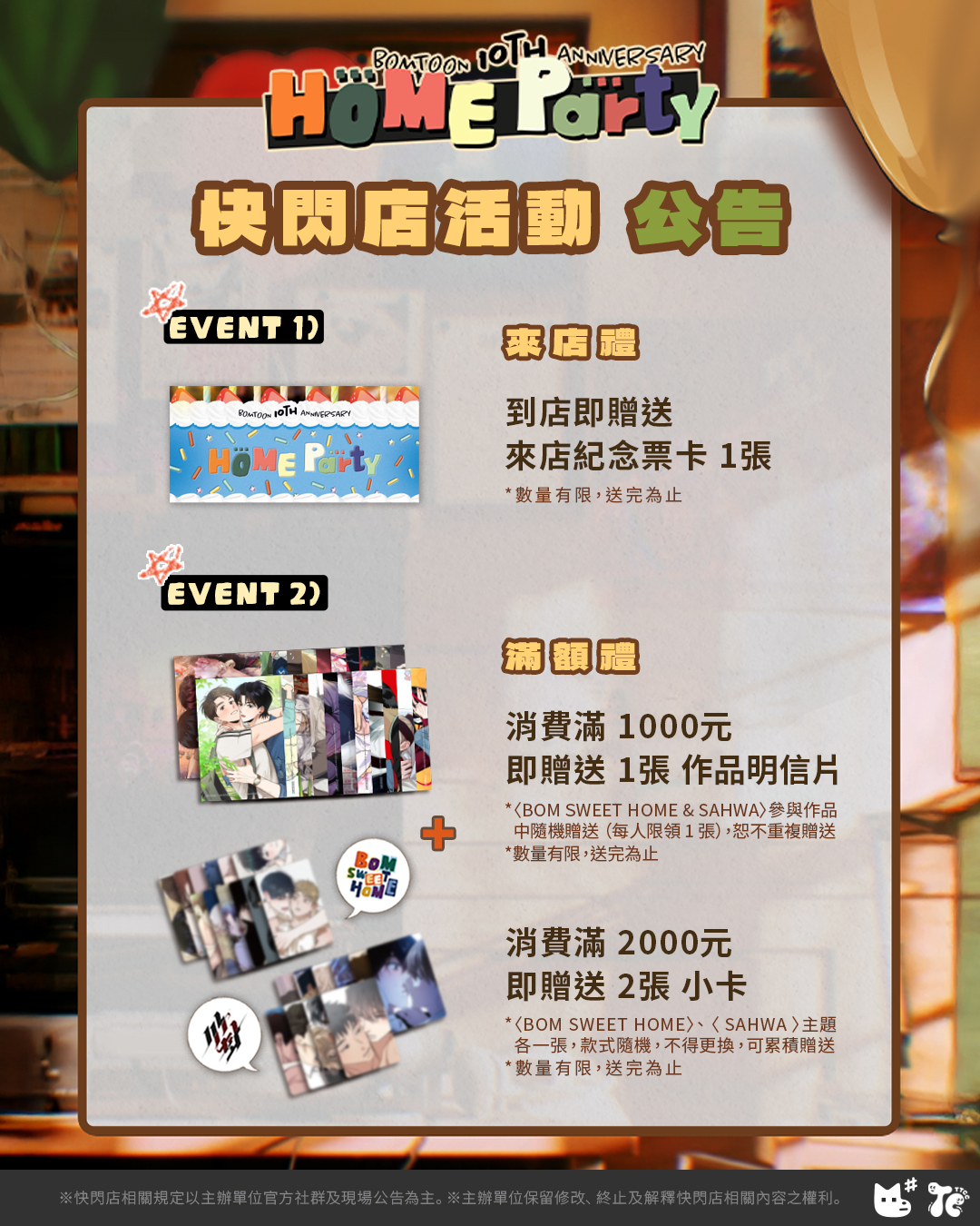 2. 消費滿 2000元,即贈送2張小卡(《BOM SWEET HOME》、 《 SAHWA 》主題各一張,款式隨機,不得更換,可累積贈送,數量有限,送完為止。)