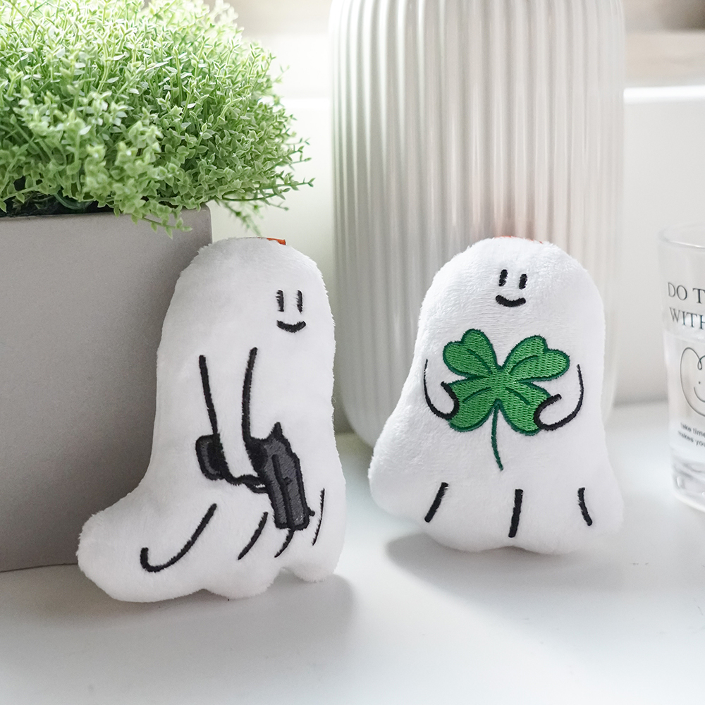 這款超可愛的幽靈絨毛吊飾,拿著幸運草或手槍,讓你隨時隨地攜帶俏皮的幽靈伙伴。